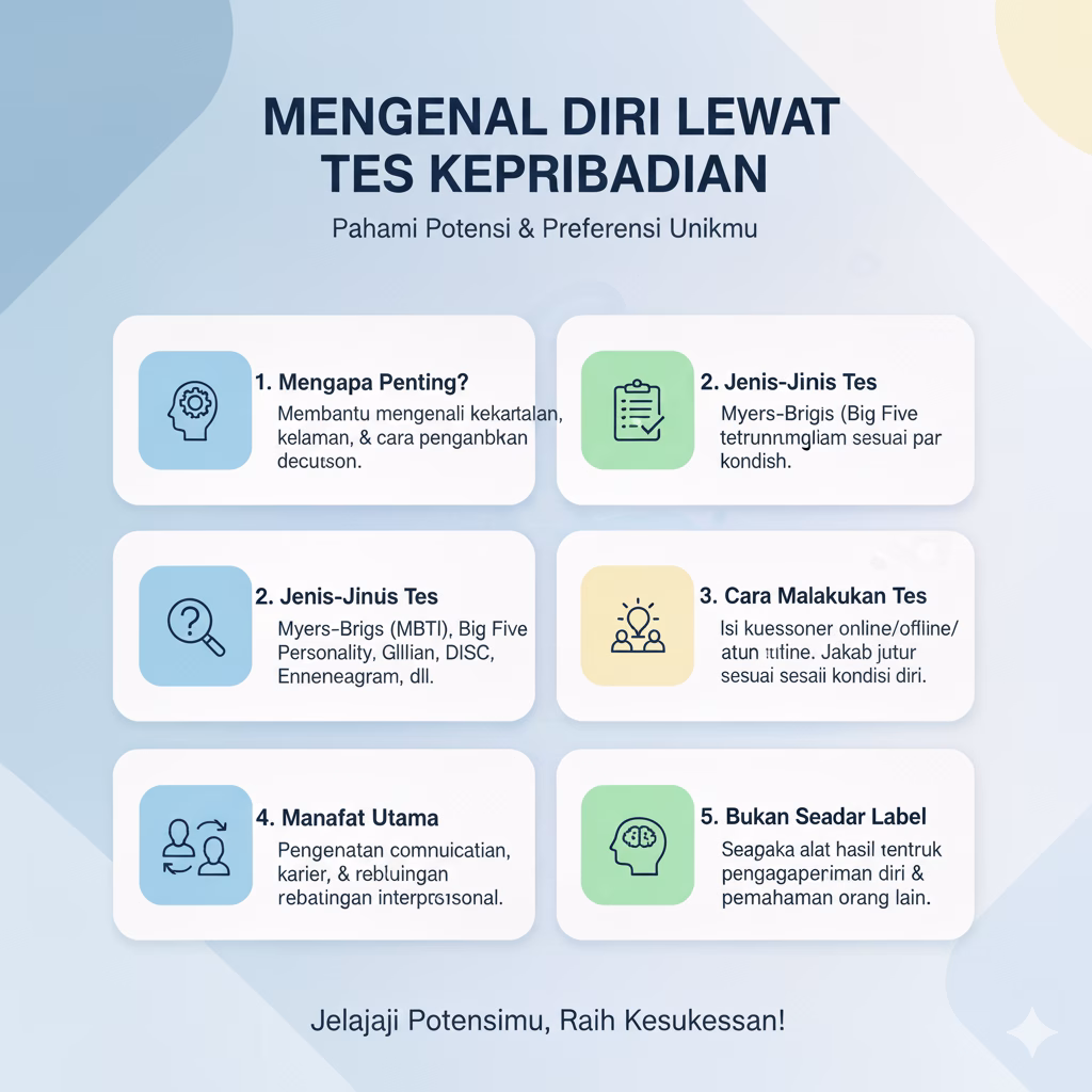 Tes kepribadian adalah alat atau metode yang digunakan untuk mengukur aspek-aspek tertentu dari kepribadian seseorang, seperti sifat dominan, cara berinteraksi, gaya kerja, hingga kecenderungan emosional. Tes ini bisa berupa kuesioner, pernyataan pilihan ganda, atau skenario yang meminta respons sesuai dengan kepribadian kita.