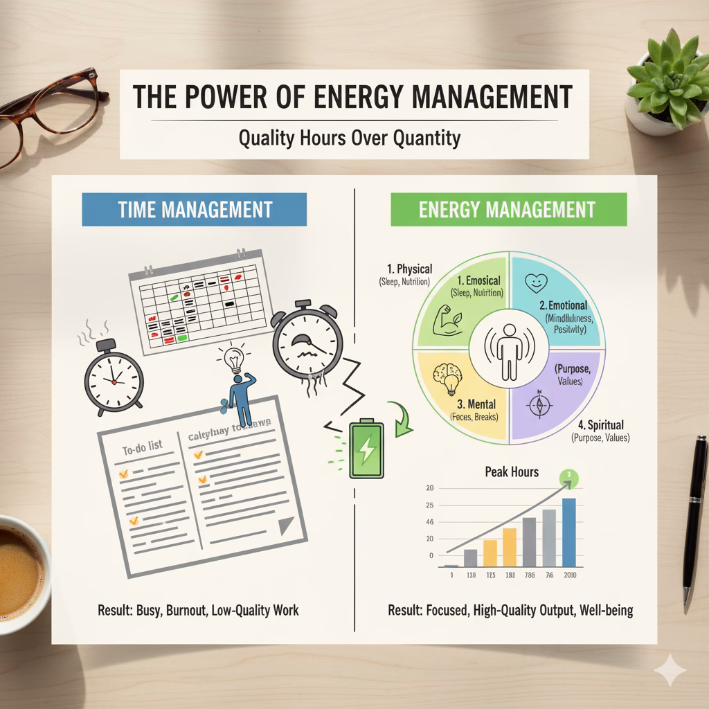 Mengatur waktu memang penting, tapi mengatur energi jauh lebih menentukan kualitas hidup dan produktivitas. Waktu adalah wadah, sedangkan energi adalah isi dari wadah tersebut. Tanpa energi, waktu sebanyak apa pun tidak akan berarti.